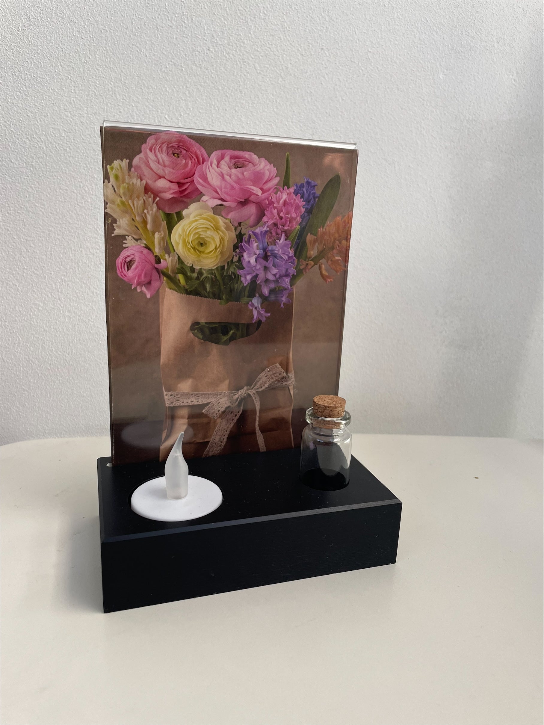 incl kaarsje met batterij en een flesje voor een plukje haar of as.